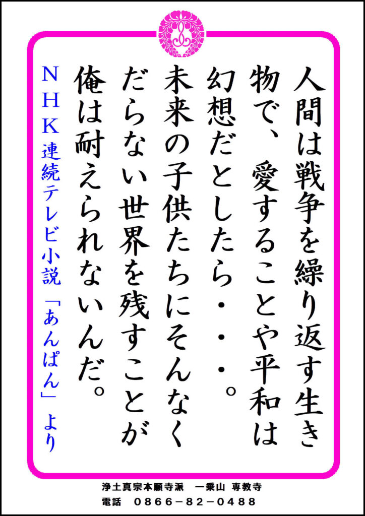 投稿公開日:2025年10月1日 投稿カテゴリー:未分類 人間は戦争を繰り返す生き物で、愛することや平和は幻想だとしたら・・・。未来の子供たちにそんなくだらない世界を残すことが、俺は耐えられないんだ。 NHK連続テレビ小説「あんぱん」より